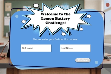 A welcome screen for an educational activity titled "Welcome to the Lemon Battery Challenge." The screen features a comic-style burst design with bold black text on a yellow and white banner. Below, there are two white input fields labeled "First Name" and "Last Name," and a grey "Continue" button. The background shows a classroom setting with lemons, a multimeter, and wires on a table.