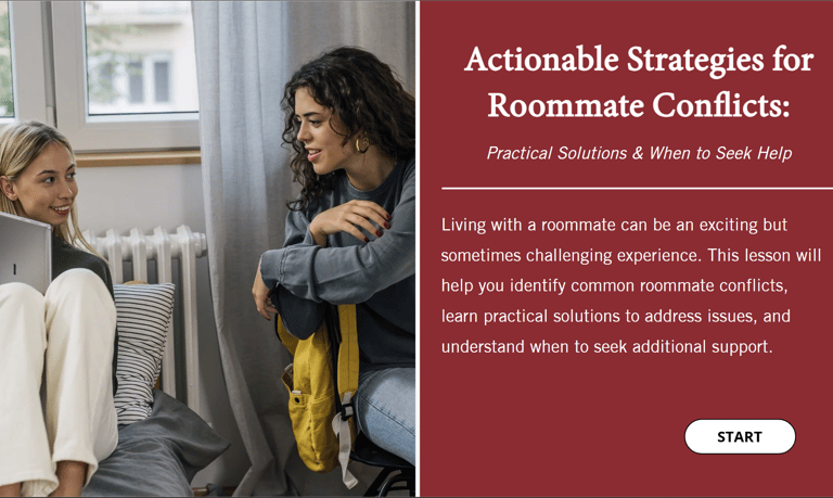 Dormageddon is an interactive eLearning lesson designed to help undergraduate students navigate common roommate conflicts. Set within the Roommate Survival 101: Navigating Conflicts with Ease course, this scenario-based game immerses learners in realistic situations where they must apply effective communication, negotiation, and conflict resolution strategies. Through engaging animations, branching scenarios, and gamified elements, students practice resolving disputes in a risk-free environment, enhancing their interpersonal skills for on-campus living.